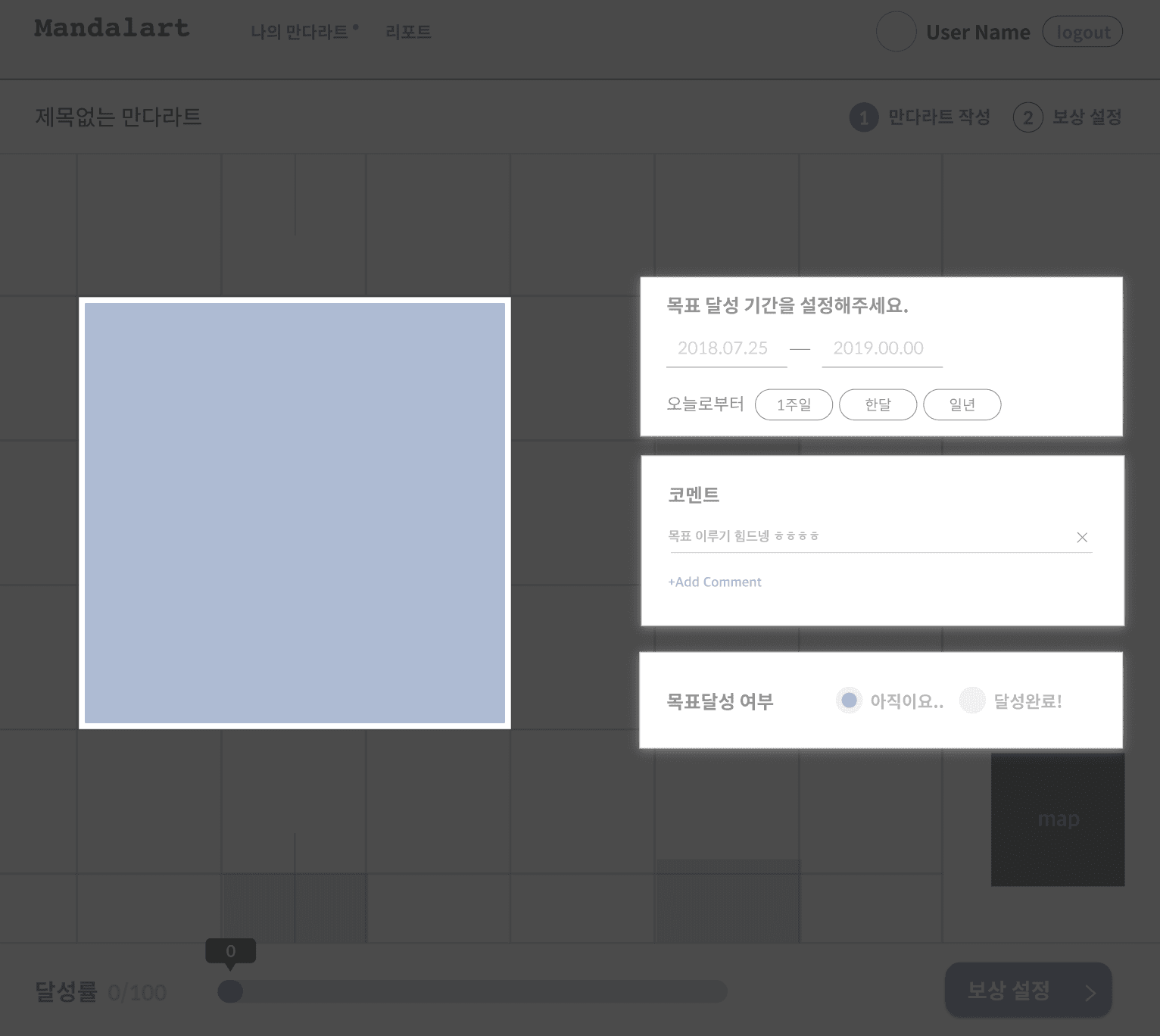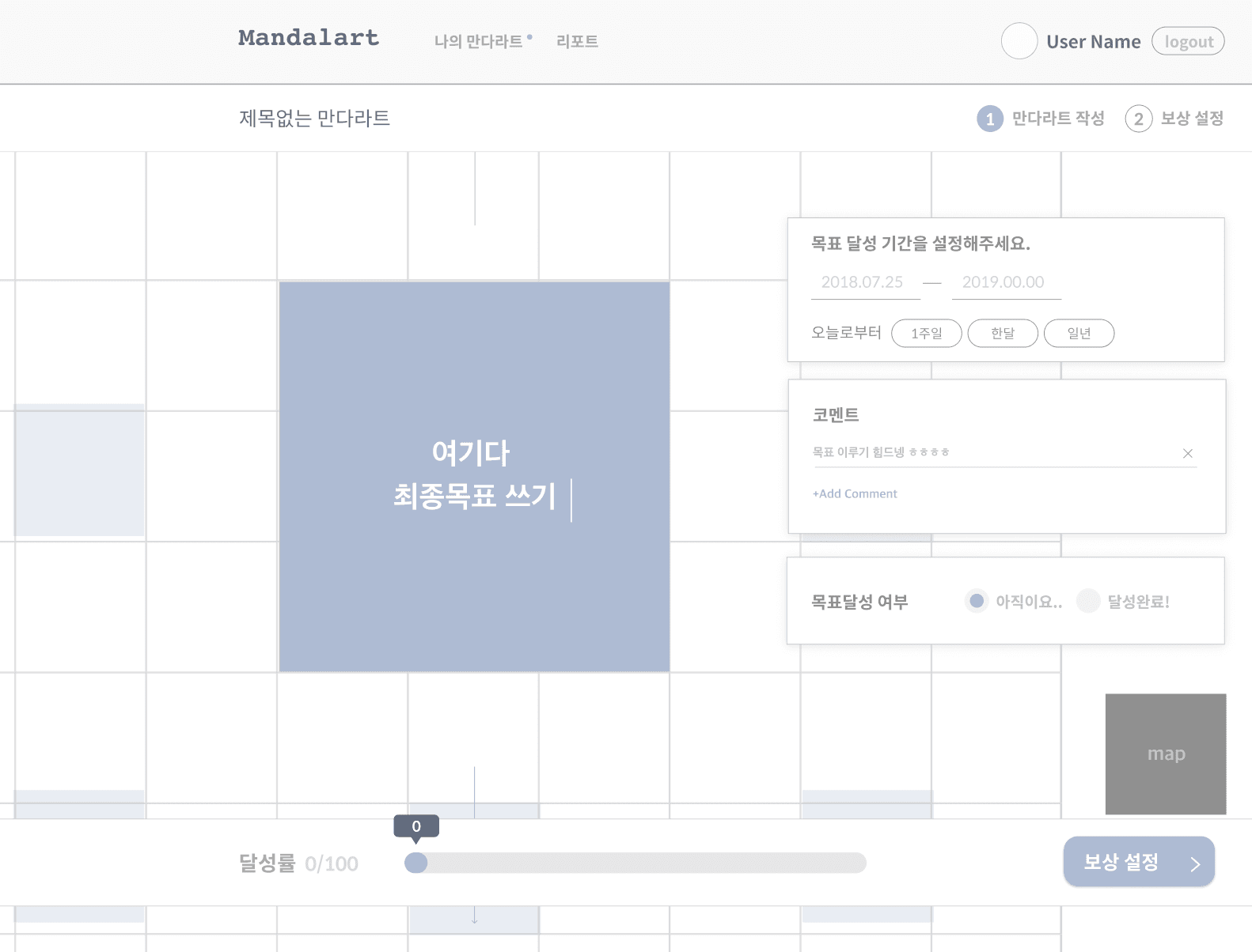 지난 글에서 말한대로 이번 만다라트 프로젝트는 한 달 안에 완성하는 것이 목표이므로 목표 달성을 도울 수 있는 최소 기능만을 뽑아 와이어 프레임을 짜보았다.
