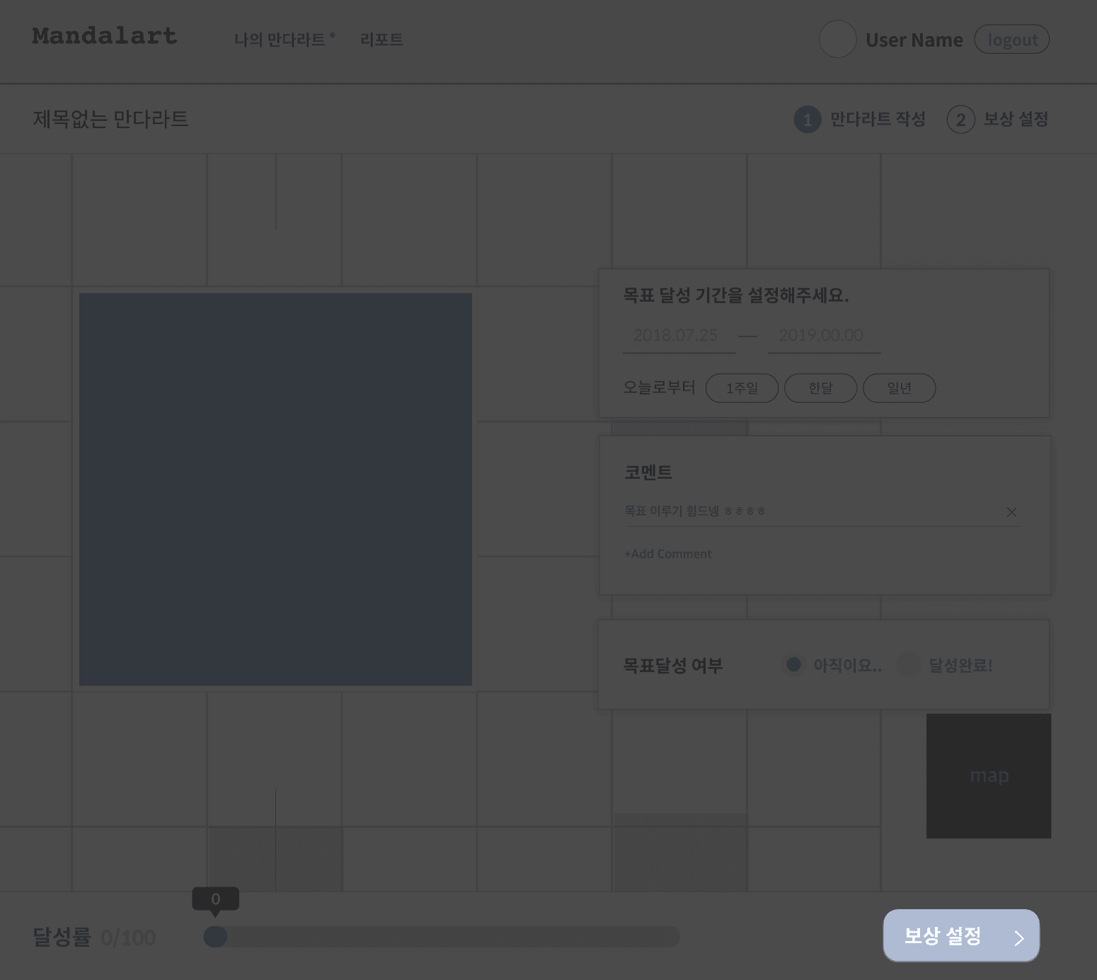 새 만다라트 만들기 버튼을 누르면 필수적으로 제목과 기간을 적어야 한다.