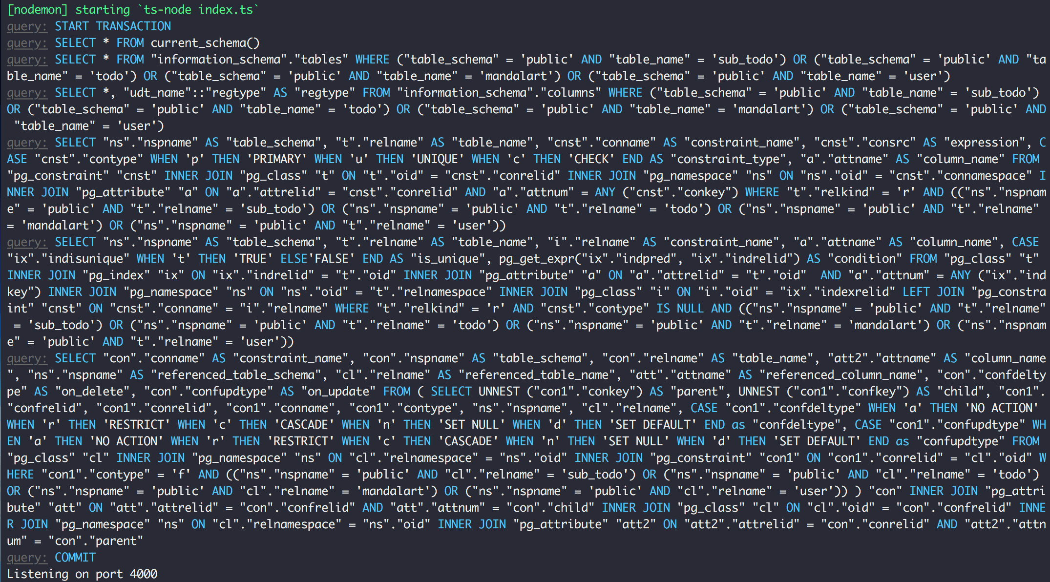 이렇게 Type과 Entity들을 작성해놓고 터미널에서 yarn dev를 실행해보면 TypeORM이 다음과 같이 SQL을 짜준다!