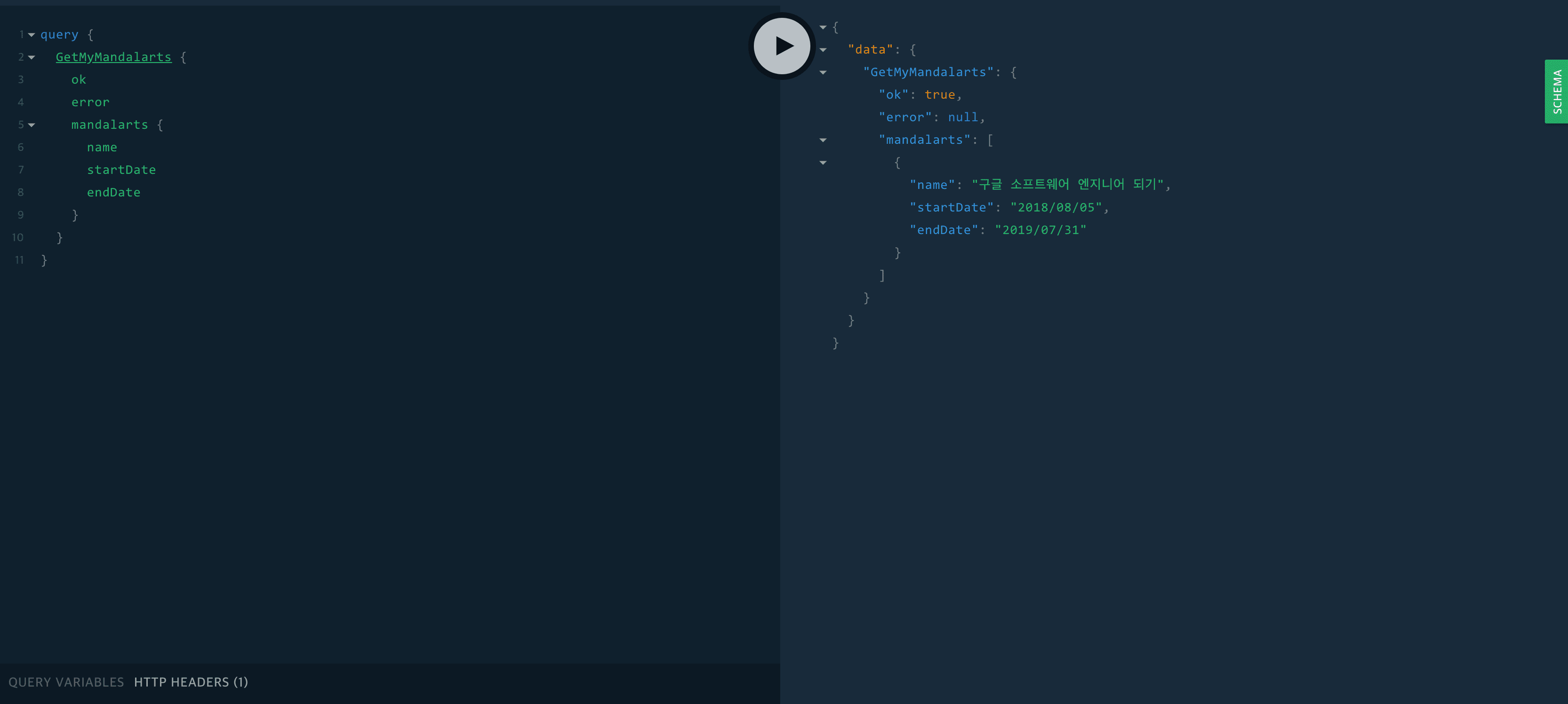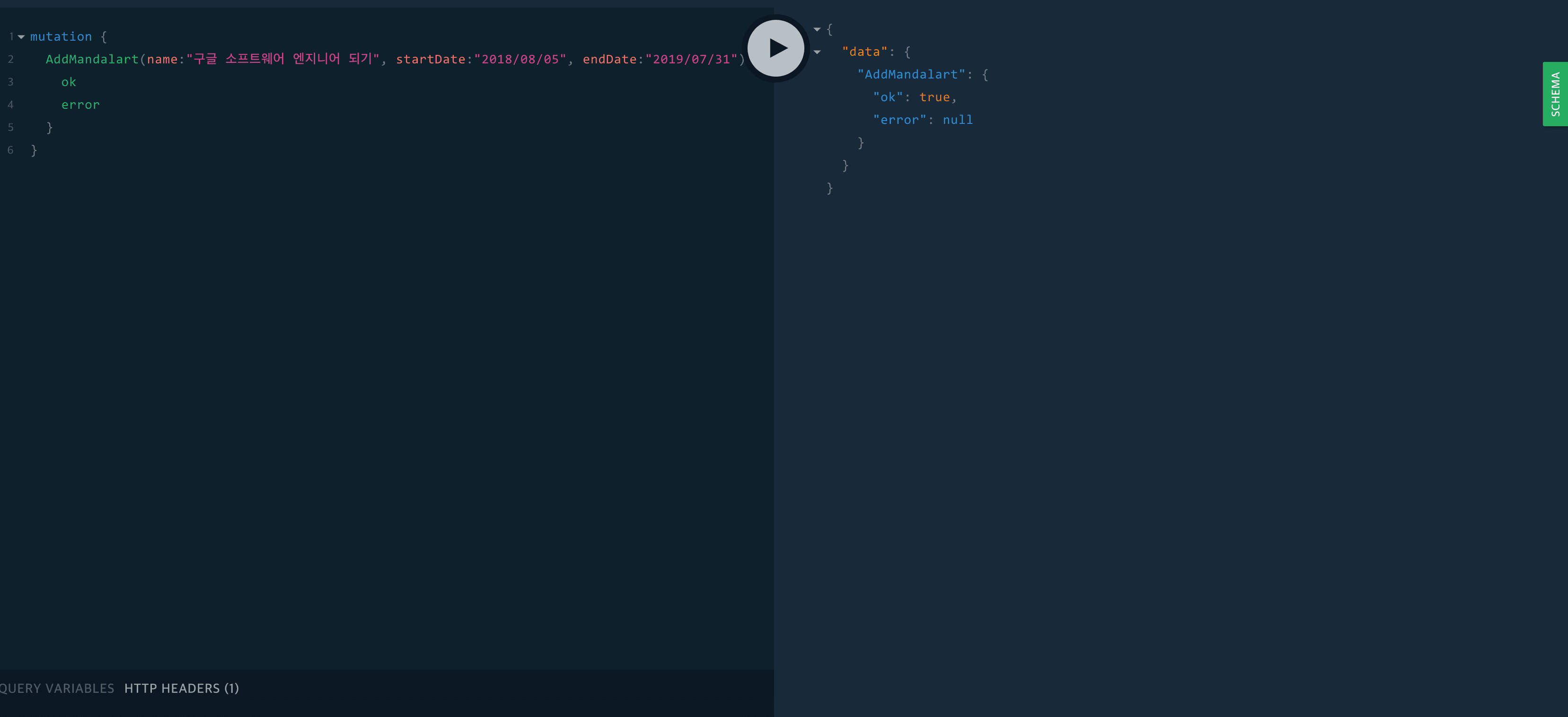 Query와 Mutation을 모두 작성했으니 이제 잘 돌아가는지 http://localhost:4000/playground에서 테스트 해보자!